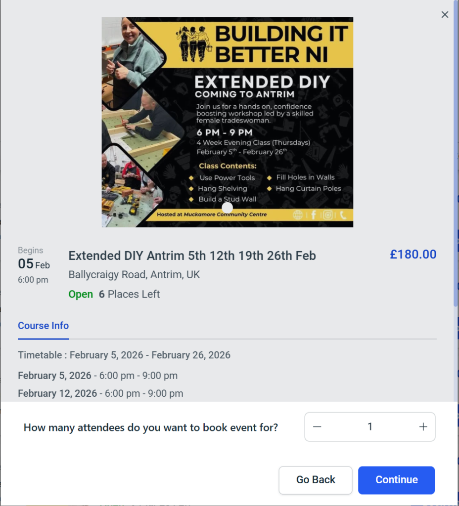 After payment completes, your place is confirmed and you’ll receive a confirmation email with your booking details. If you don’t receive it within 5 minutes, check spam/junk and then contact us.The email address you gave may have an error in the spelling and we will be able to correct it. Its needed to be able to log in and view your orders in staging.buildingitbetterni.com/Customer-panel