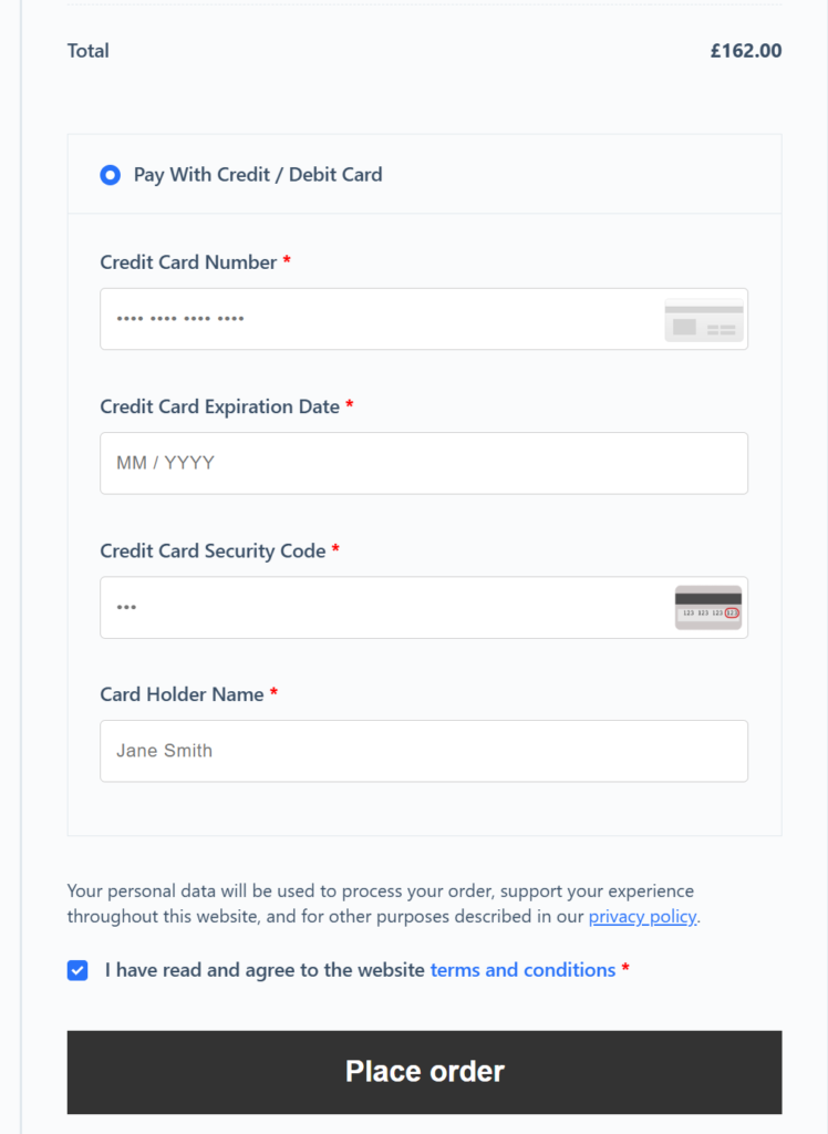The final payment page. Make sure all your contact details are correct and dont forget to view and tick the “I have read and agree to the website Terms and Conditions tick box. Click on Place Order